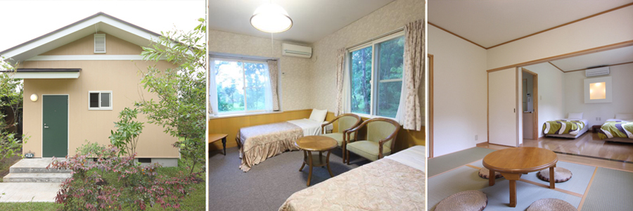 広大な敷地に別荘感覚でお過ごしいただける離れ5棟の客室。阿蘇の大自然とともにゆっくりとした時間をお楽しみください。